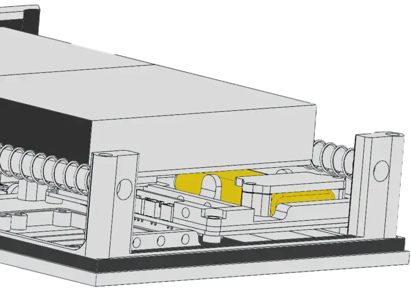 With the locking mechanism solved, the storage compartment still needed a way to slide open and closed smoothly. For this, I decided on using two 8mm diameter rods flanking the storage box that served as guides. The box itself had 8mm drylin bearings attached to it that slid along these rods.
